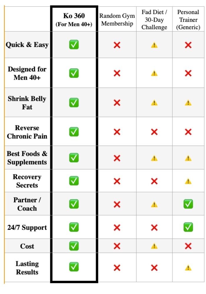 - Ko 360 gives you a system built for men over 40 — addressing fat loss, strength, energy, hormones, joints, sleep, and longevity all in one.